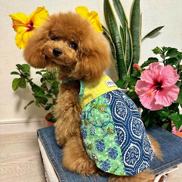 ※ 柄の出方は生地の裁断により一点一点異なりますのでご了承くださいませ。 ハワイ直輸入のハワイアンファブリックを贅沢に使用した、夏にぴったりのサンドレスです。 肩でリボンをきゅっと結ぶデザインが愛らしく、背中姿も映える一枚。 ハリのあるしっかりとしたコットンポリ素材で、元気に走り回るワンちゃんにも安心の丈夫さ◎ 鮮やかなボタニカルプリントとふんわりフリルが、リゾート気分をさらに引き立ててくれます 普段のお散歩にも、夏のお出かけにもぴったりなアイテムです。 生地はトロピカルでハッピーな5種類 ● ハイビスカスandプルメリア ( muffinくん・ムギくん着用 ) / 綿100% ● リーフandレフアフラワー ( リリィちゃん着用 ) / ポリエステル65%・コットン35% ● ティアレ ( 凛ちゃん着用 ) / ポリエステル65%・コットン35% ● モンステラandホヌ ( ひなちゃん着用 ) / ポリエステル65%・コットン35% ハワイならではの花や葉、ホヌなどをモチーフにした美しい柄です。 WOOFのサンドレスはふんわりな後ろ姿もとってもキュートで愛おしい せなキュンなスタイルです。 ◼️ モデル : Muffinくん ( ビションプー / 3.8kg ) 着用サイズ / M ◼️ モデル : HINAちゃん ( マルプー / 2.9kg ) 着用サイズ / S ◼️ モデル : Lilyちゃん ( マルプー / 2.9kg ) 着用サイズ / S ◼️ モデル : Mugiくん( Mチュアダックス / 5.0kg ) 着用サイズ / DM ◼️ モデル : RINちゃん ( Kダックス / 3.5kg ) 着用サイズ / DS