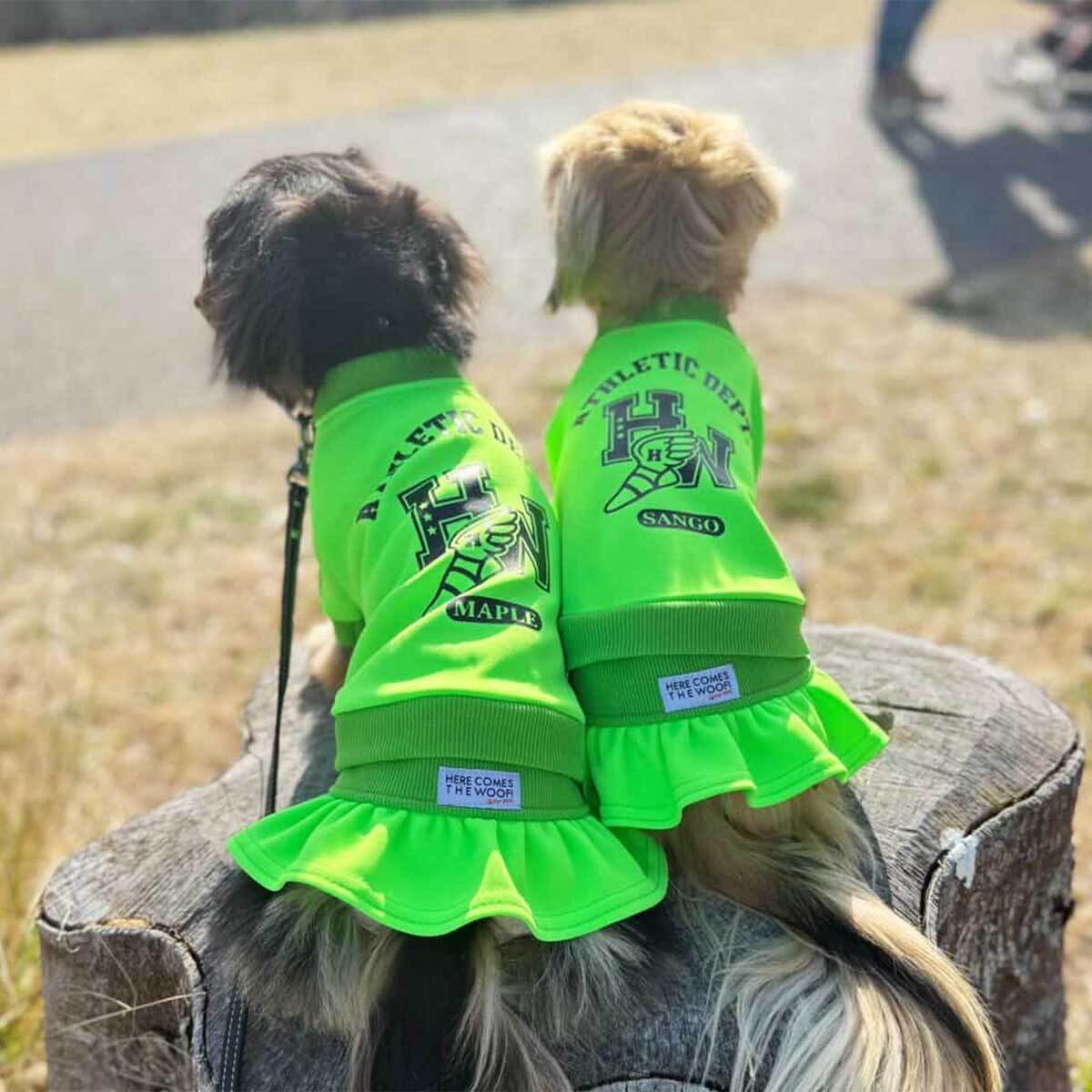 HERE COMES THE WOOF! らしいネオンカラーのジャージスカート。