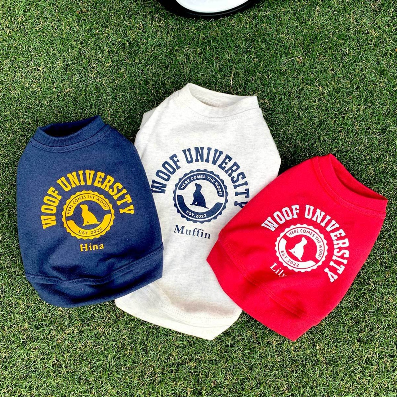 ネーム入りドッグウェア★わんちゃんのお名前が入るカレッジTシャツ★オートミール ペットグッズ ネーム入り 名入れ ヴィンテージ風 ペットウェア 半袖 セミオーダー | HERE COMES THE WOOF!