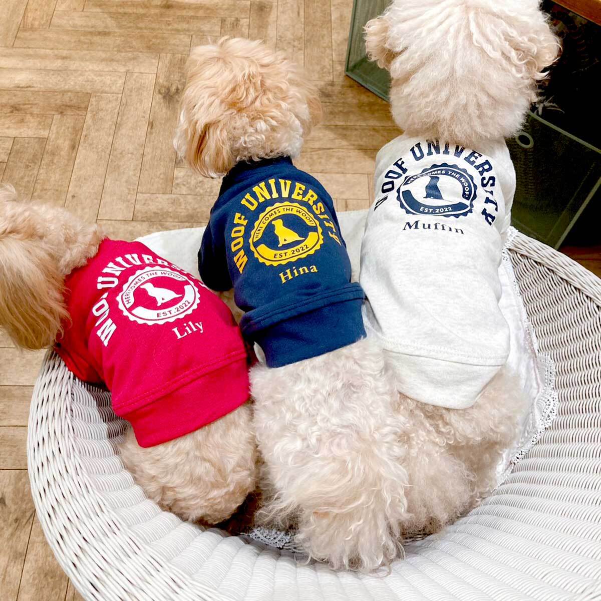 かわいいヴィンテージ風カレッジTシャツに、わんちゃんのお名前を入れてみませんか?